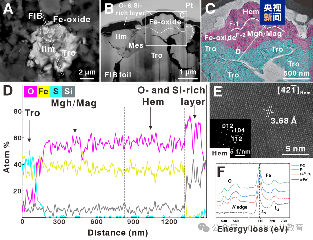研究提出,赤铁矿的形成可能与月球历史上的大型撞击事件密切相关。大型撞击形成瞬时高氧逸度气相环境的同时,铁元素在高氧逸度环境中被氧化,使陨硫铁发生了脱硫反应,经气相沉积过程形成微米级晶质赤铁矿颗粒。值得关注的是,该反应的中间产物为具有磁性的磁铁矿和磁赤铁矿,可能是南极-艾特肯盆地边缘磁异常的矿物载体。该研究首次利用样品证实了在超还原背景下月球表面存在赤铁矿等强氧化性物质,揭示了月球的氧化还原状态以及磁异常成因。