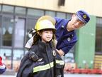 10月17日,四川省乐山市实验幼儿园文星分园,孩子们正在消防员的指导下体验穿戴消防服。