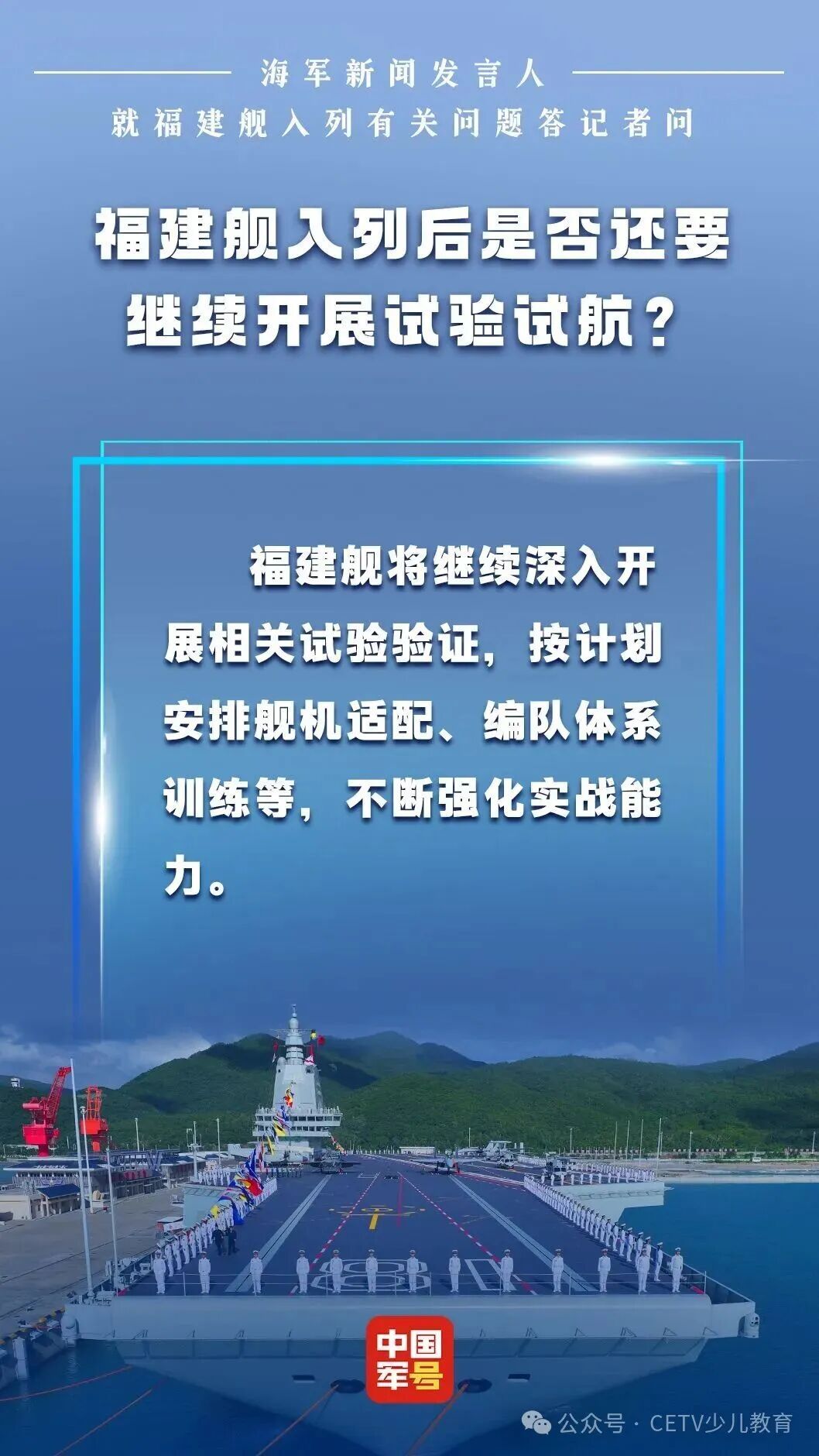 关于福建舰入列后是否还要继续开展试验试航,何时能够形成实战能力,冷国伟表示,福建舰是我国第一艘电磁弹射型航母,是海军转型建设跨越式发展的标志性装备,很多设备和技术都是第一次实际运用,入列后该舰将继续深入开展相关试验验证,进一步检验平台系统稳定性,同时将按计划安排舰机适配、编队体系训练等,不断强化实战能力。