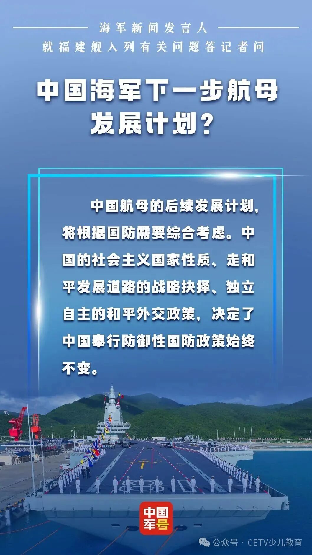 据中国军号11月8日报道,11月5日,我国第一艘电磁弹射型航空母舰福建舰在海南三亚某军港入列。8日下午,海军新闻发言人冷国伟就福建舰部署地点、舰载机配备和中国海军航母发展计划等问题,接受记者书面采访。