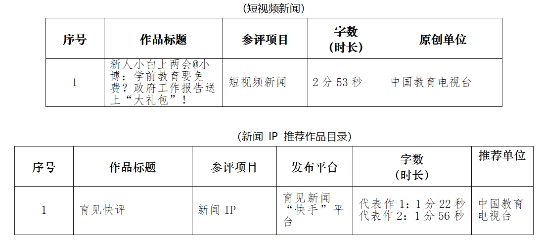 根据中国行业报协会《关于全国行业好新闻大赛短视频新闻、新闻IP评选工作的补充通知》相关要求,现在中国教育网络电视台对我台报送的作品进行公示,欢迎社会各界监督、评议。如有不同意见,可在本公告公布之后的5个工作日内向中国教育电视台总编室反映。