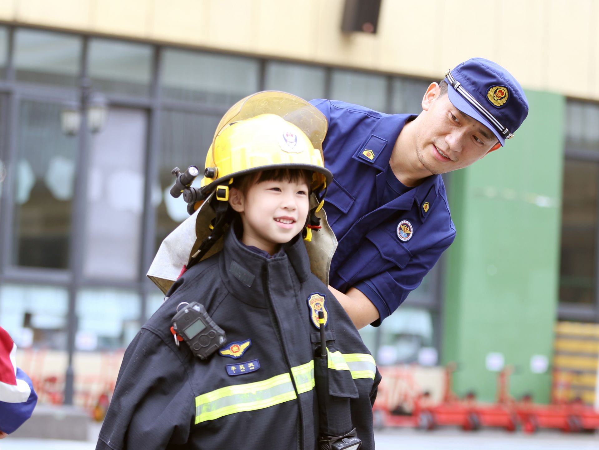 10月17日,四川省乐山市实验幼儿园文星分园,孩子们正在消防员的指导下体验穿戴消防服。